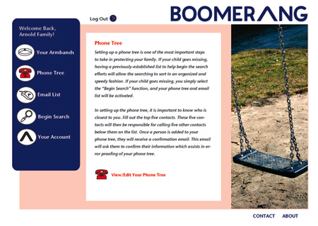 This website is part of a branding project for a children's rescue company. By having an online account, families can activate emergency emails and phone trees to help find missing children.