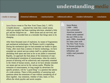 This website was built around Marshall McLuhan's article, "Understanding Media." The goal was to achieve an organized website with a typographic only solution.